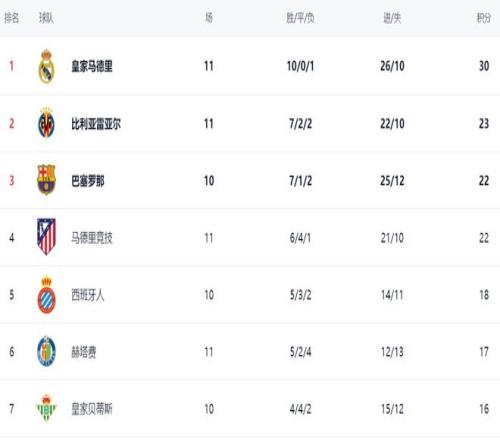 在積分榜上,皇馬10勝1負的戰績太出色了,以30分高居榜首。比利亞雷亞爾7勝2平2負,拿到23分,排名第2。少賽一輪的巴薩只有22個積分,排名第3。馬競也是22分,凈勝球落后,只能排名第4。西班牙人18分排名第5。第6的是赫塔費,拿到17分。